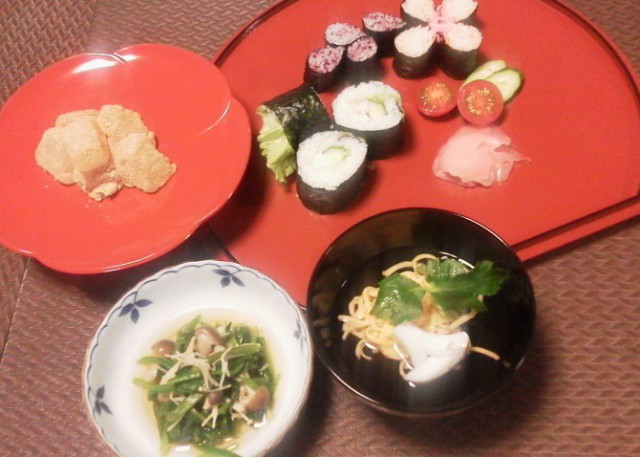 | メニュー | 親子で楽しいデコレーション巻き寿司、黄身そうめんのおすまし、ほうれん草ときのこの煮びたし、わらびもち |