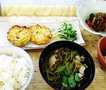 | メニュー | 豆腐ハンバーグ&大根おろしソース、ピーマンのきんぴら、沢煮椀 |